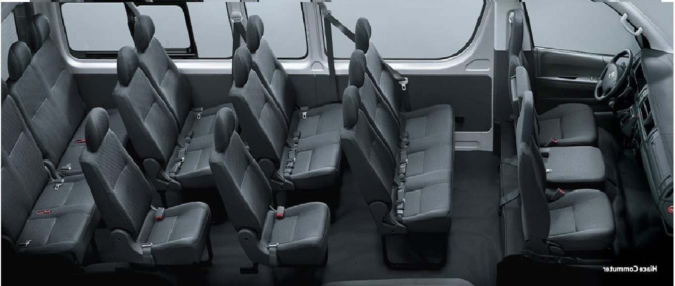 Toyota Hiace minibus standar memiliki 14 bangku dengan kemungkinan tambahan 1 bangku diantara pengemudi dan penumpang di bagian depan. Total dengan pengemudi maksimal bisa menampung 16 orang.